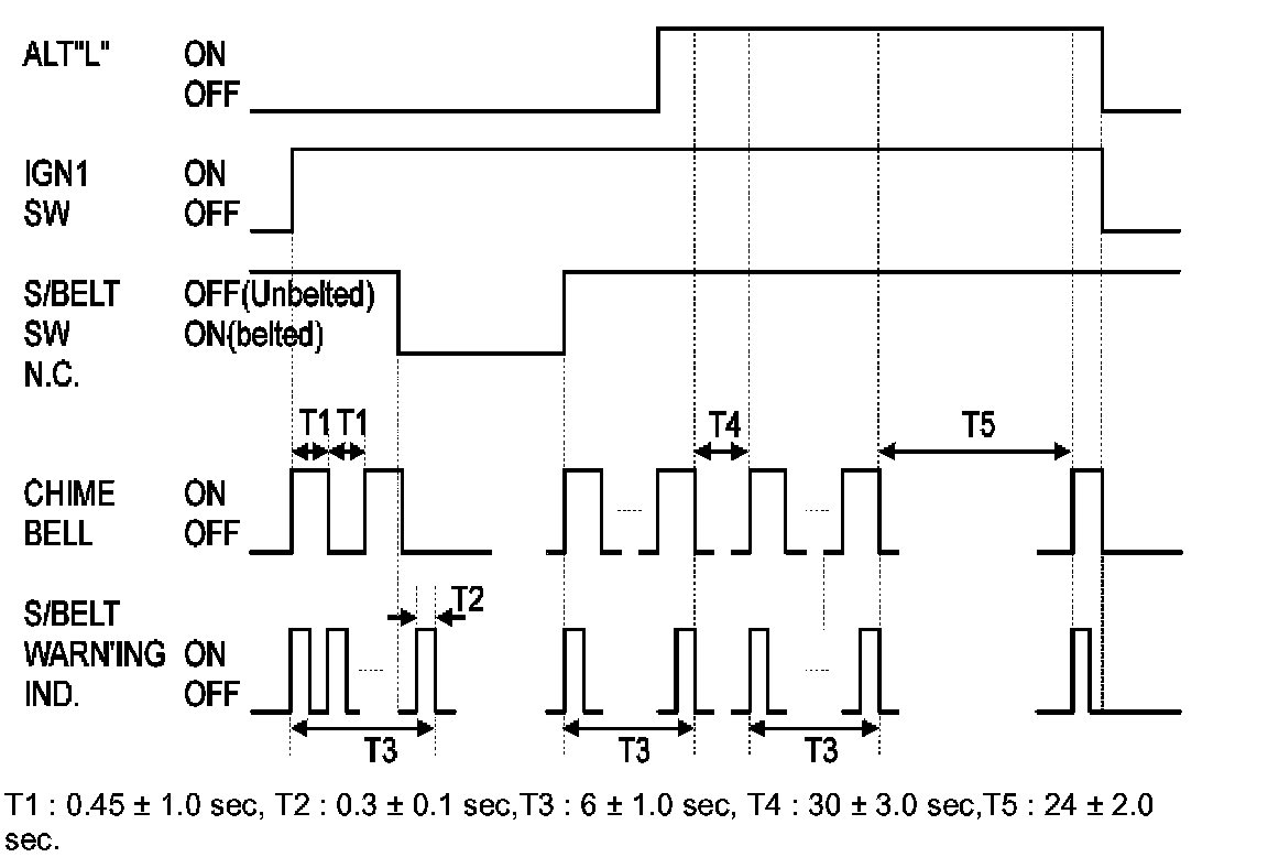a. Warning Lamp lights every 0.6 sec and Warning Bell sounds every 0.9 sec for 6 sec when IGN1 switch is ON under unfastened S/Belt. (Warning lamp continues to light for 6 sec if S/Belt is fastened within 6 sec) 30 sec-TIME COUNT starts at ALT "L" ON under this state. (30 sec-TIME COUNT starts after 6 sec. If ALT "L" is ON within initial 6 sec)