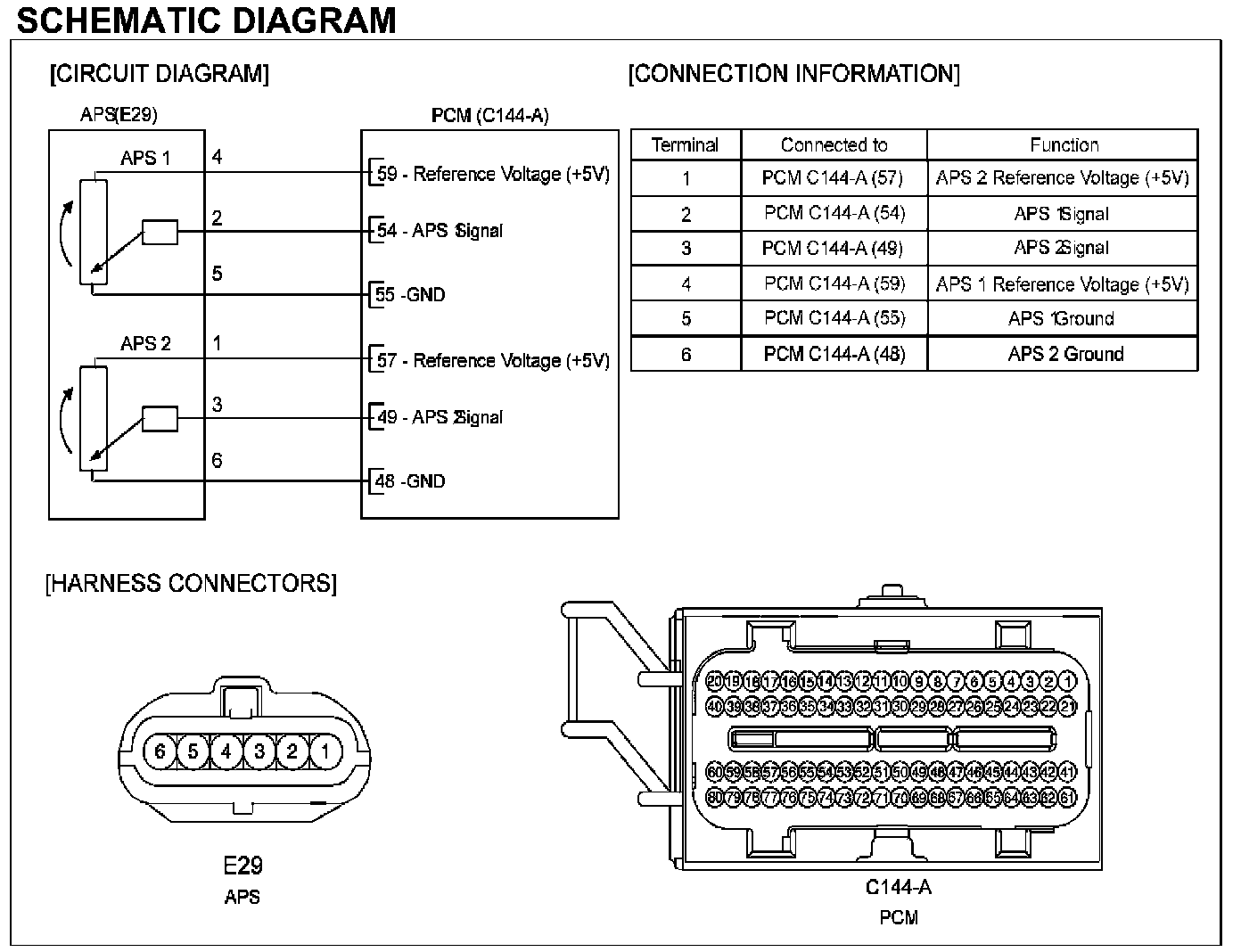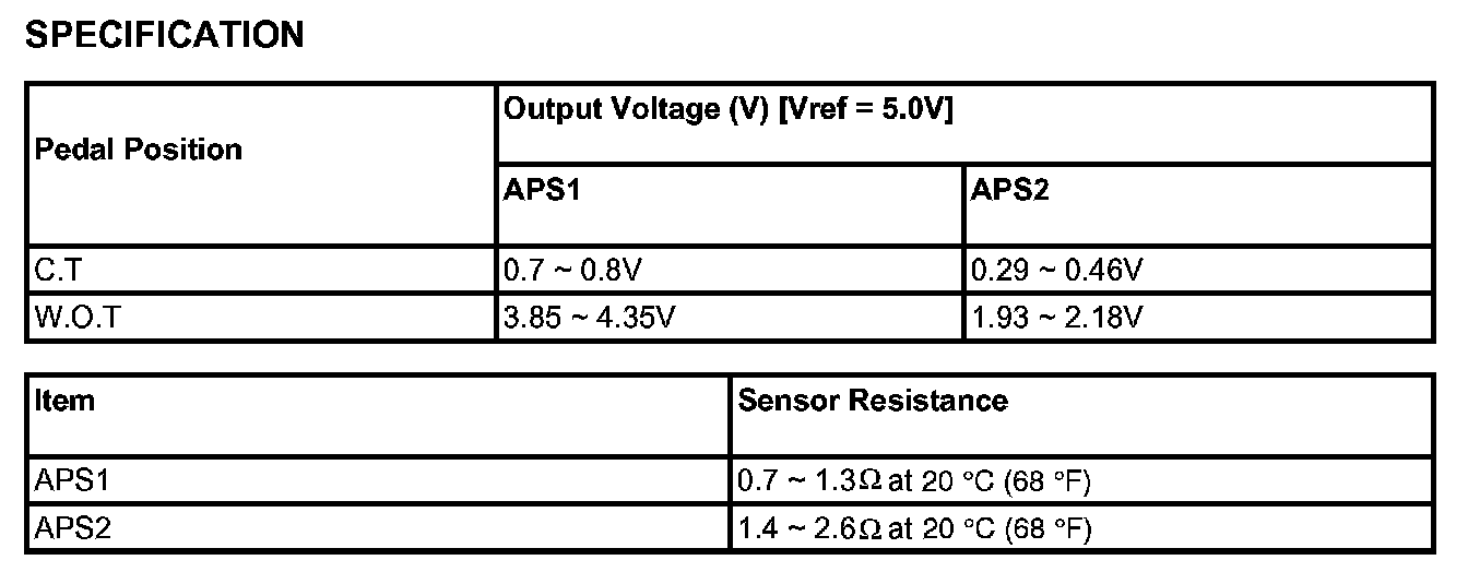 Accelerator Position Sensor (APS) is installed on the accelerator pedal module and detects the rotation angle of the accelerator pedal. The APS is one of the most important sensors in engine control system, so it consists of the two sensors which adapt individual sensor power and ground line. The second sensor monitors the first sensor and its output voltage is half of the first one. If the ratio of the sensor 1 and 2 is out of the range (approximately 1/2), the diagnostic system judges that it is abnormal.
