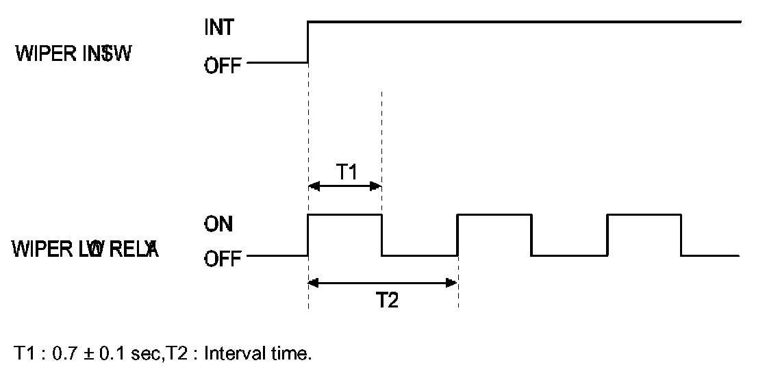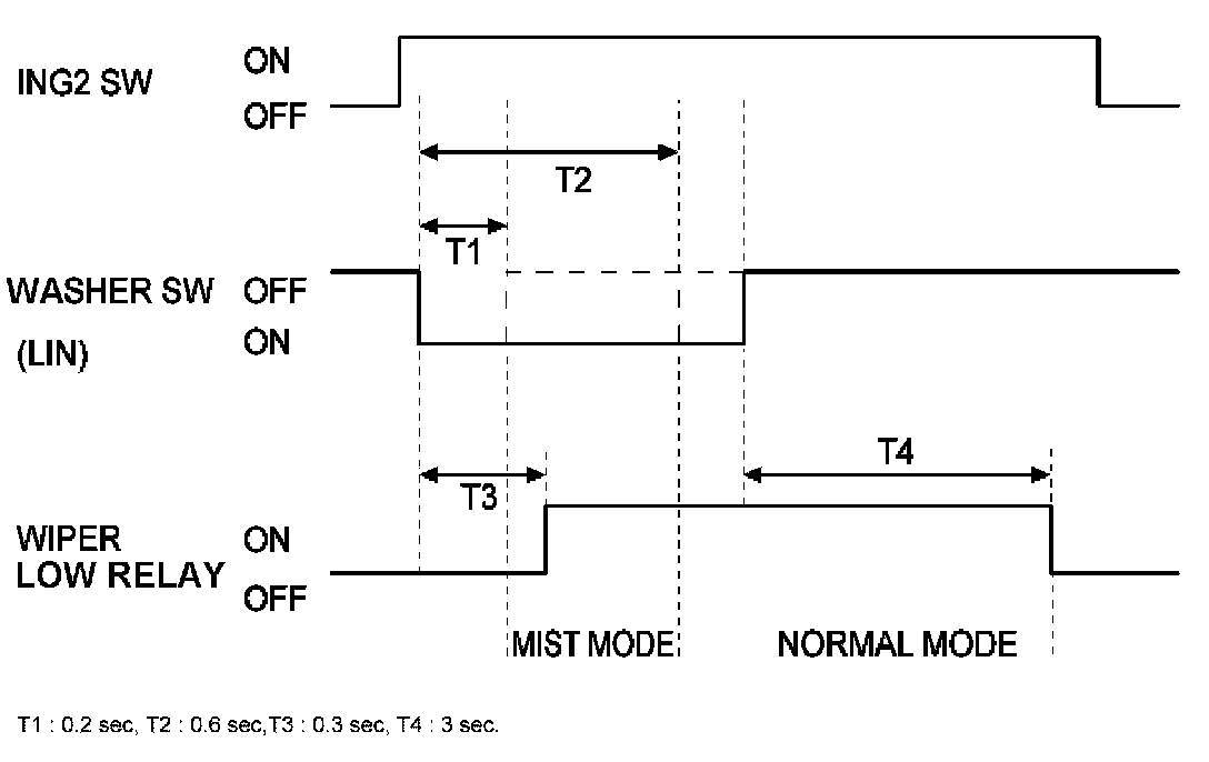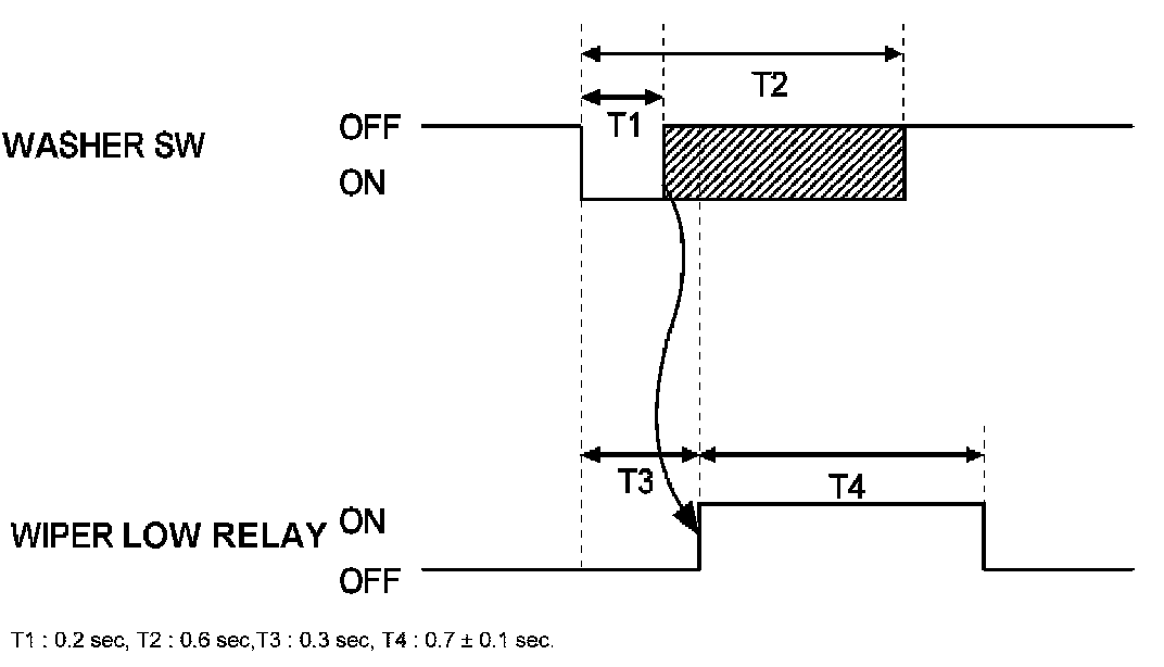 A. If the duration of washer switch input is measured from 0.2 sec to 0.6 sec, after T3, the wiper low relay output is ON for 0.7 sec. (For 1 Time wiping)