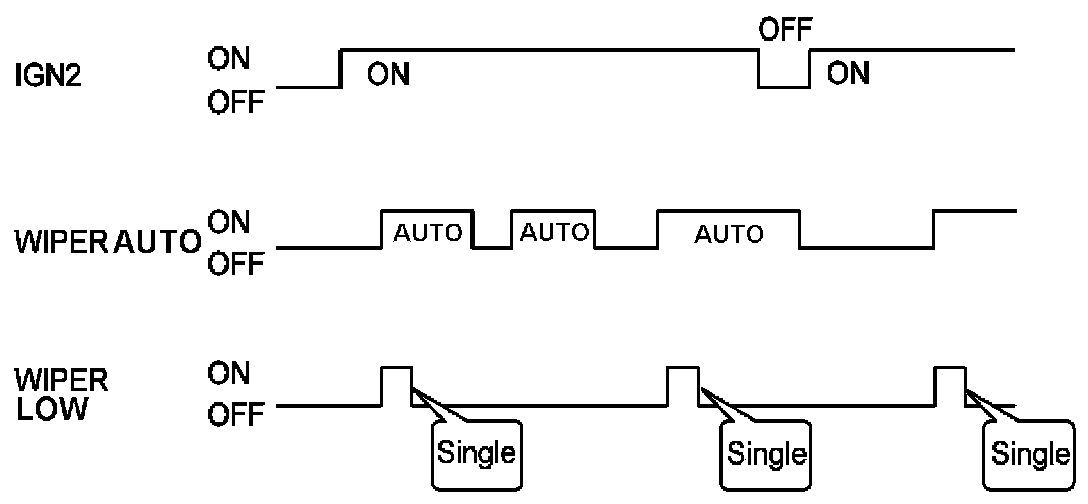 C. A single wipe will be performed whenever rain has been detected (Rain Detected signal from Rain sensor) and the wiper switch is moved to the AUTO position. But a single wipe will not be performed when the wiper switch is moved to the AUTO position and OFF signal is being received from Rain sensor. But if the wiper switch is moved to AUTO position for the first time since vehicle ignition switch is turned on then a single wipe will be performed regardless of Rain Detected or OFF signal.
