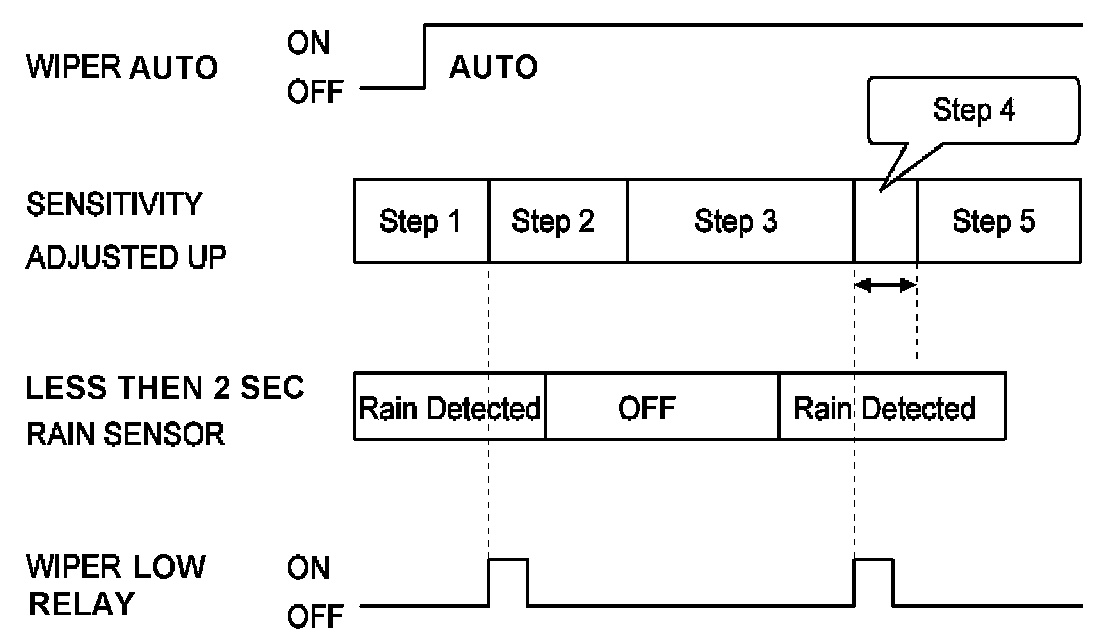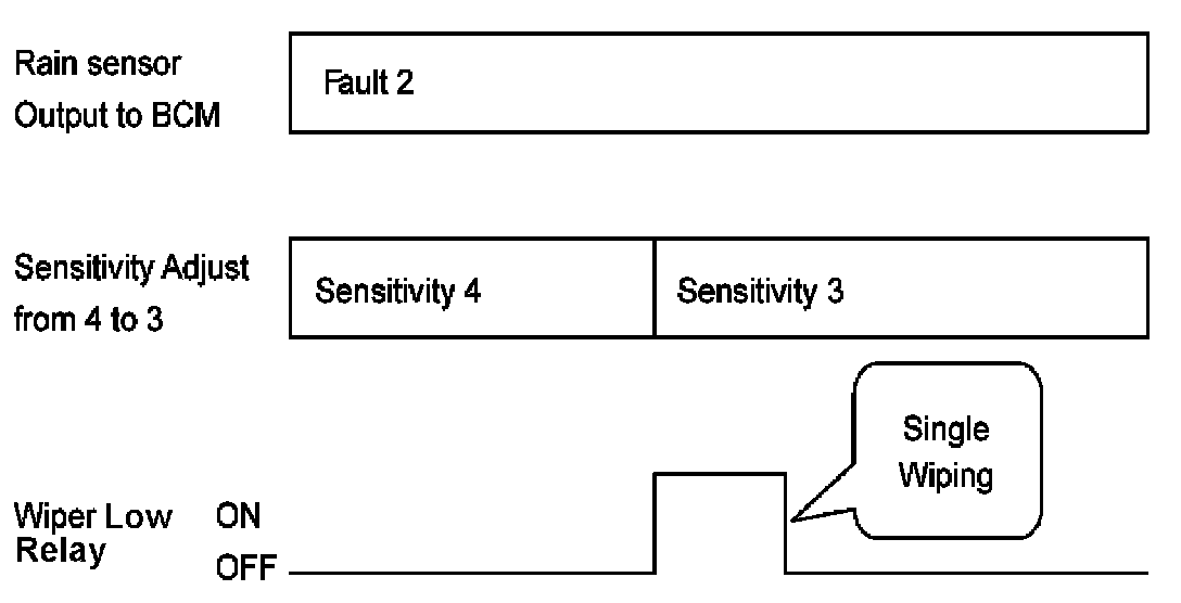 D. The drive may adjust the rain sensor performance by adjusting the sensitivity input. When in automatic mode, the BCM will perform a single wipe each time the sensitivity is adjusted upward to a more sensitive setting (downward more then one step). This single wipe will only be performed if Rain Detected signal is being received from the Rain sensor. If the sensitivity adjustment is adjusted upward more than one sensitivity, the BCM will only perform a single wipe unless the time between Increases is more than 2 seconds.