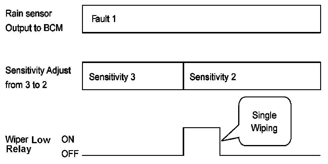 Rain Sensor Fault 1 - Internal Fault Detected This failure is detected when the wiper is in automatic mode and the input faulty rain sensor from the rain sensor has a duty cycle corresponding to Fault 1. The confirmation delay for the failure is of 1 sec. When this failure is detected, the wiper outputs are OFF and the wiper will also do a wipe in slow speed on the transition from sensitivity 3 to sensitivity 2 (Step 2 to 3) in order to signal the presence of this fault. If another sensitivity is set, the wiper won't make any additional wipe.