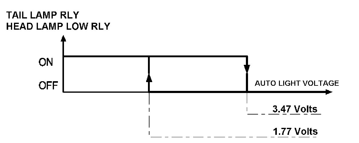 In the state of IGN1 ON, when multi function switch module detects auto light switch on, tail lamp relay output and head lamp low relay output are controlled according to auto light sensor's input. The auto light control doesn't work if the pin sunlight supply (5 V regulated power from Ignition 1 power to sunlight sensor) is in short circuit with the ground. If IGN1 ON, The BCM monitors the range of this supply and raises up a failure as soon as the supply's voltage is out of range. Then this failure occurs and as long as this is present, the head lamp must be turned on without taking care about the sunlight level provided by the sensor. This is designed to prevent any head lamp cut off when the failure occurs during the night.