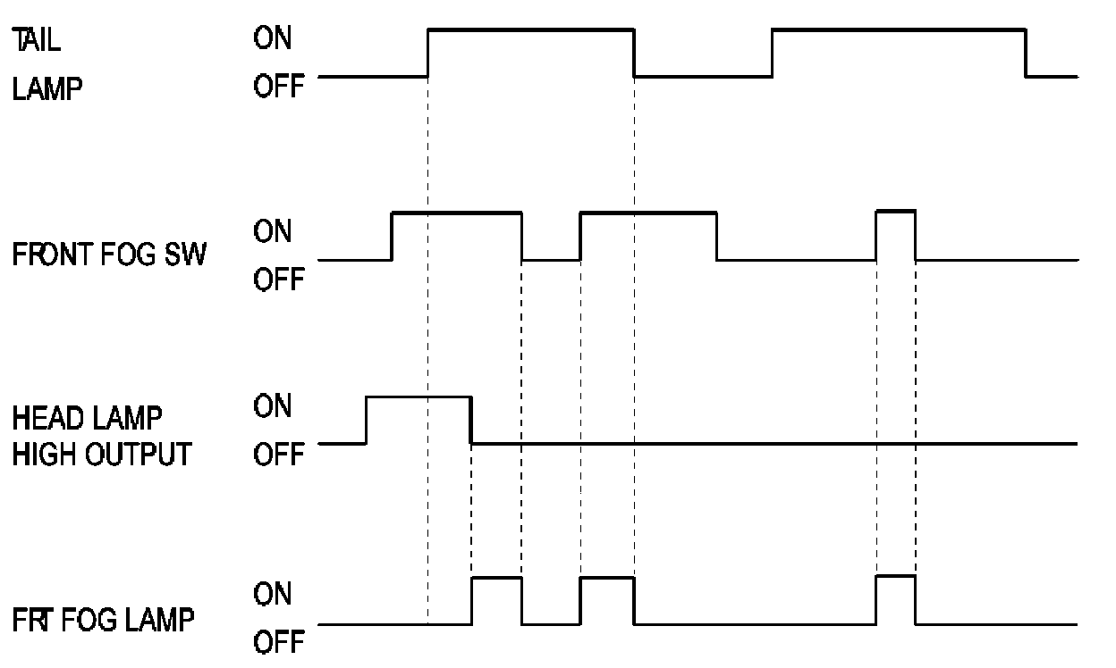 In case of (IGN 2 = ON) & (HEAD LAMP LOW OUTPUT = ON) & (HEAD LAMP HIGH OUTPUT = OFF) status, if front fog switch input is detected (LIN communication), front fog lamp relay output is turned ON.