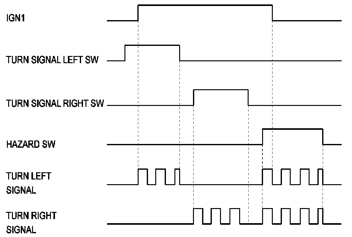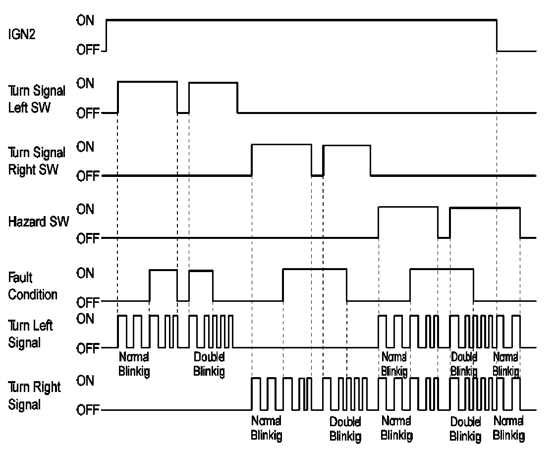 A. Normal operating condition Turn signal period : 85 ± 10 period/min While IGN2 is ON if turn signal left switch or turn signal right switch or hazard switch input is detected, then turn signal outputs are turned ON following the switch input (left, right or hazard).
