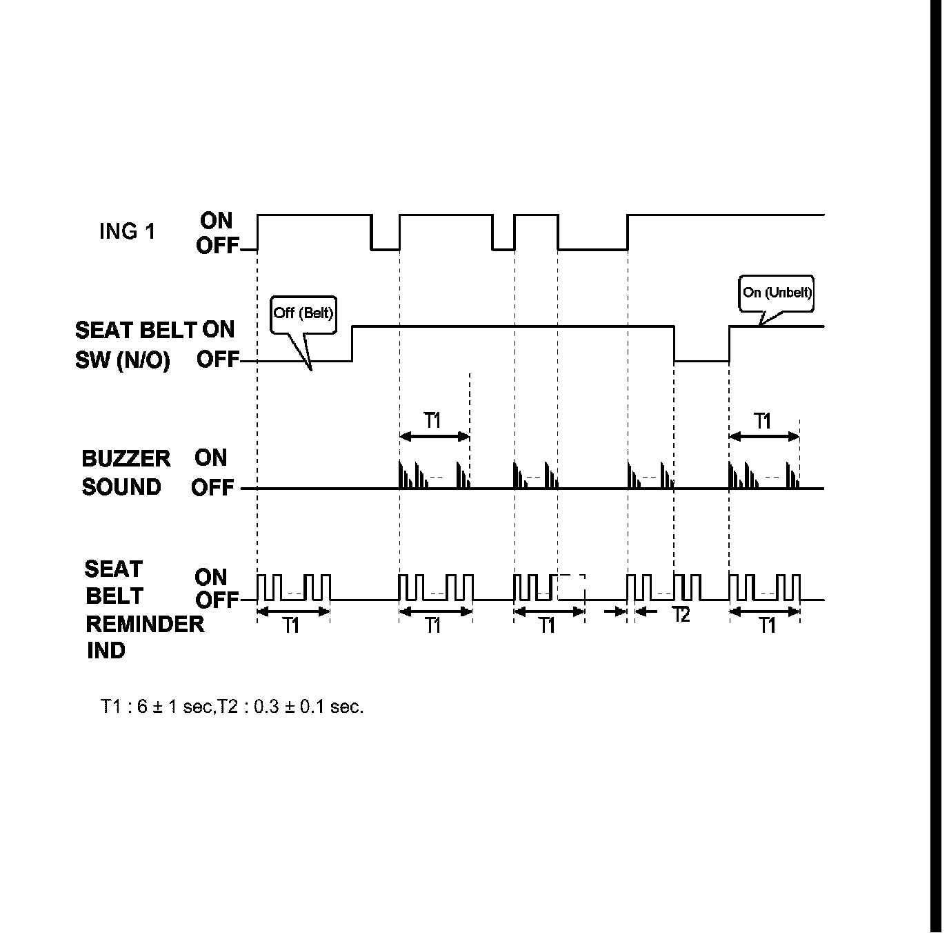 A. Seat belt reminder lamp and reminder sound stop at IGN1 OFF during the operation With a seat belt switch on, reminder sound stops immediately but seat belt reminder indicator continues working for the remained time.