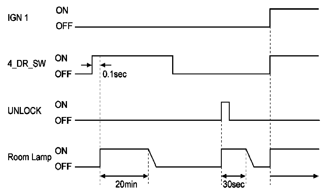 A. When room lamp off & IGN1 off & all door closed, if transition of all doors closed to not (all doors closed) for more than 0.1 sec, room lamp is turned on for 20 min.