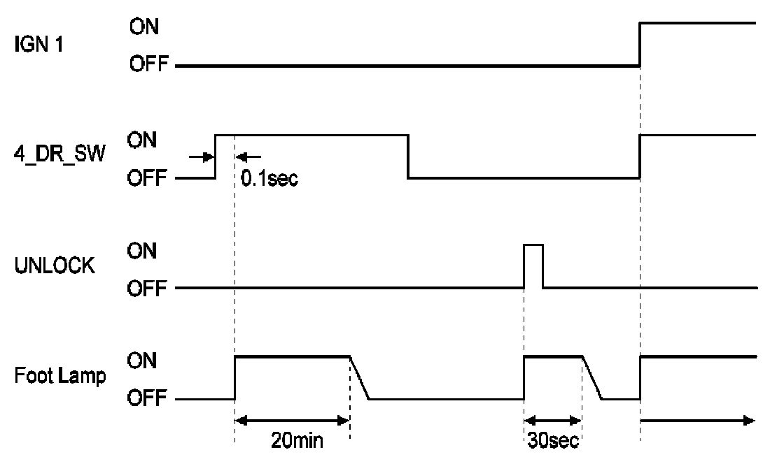 A. When foot lamp off & IGN1 off & all door closed, if transition of all doors closed to not (all doors closed) for more than 0.1 sec, foot lamp is turned on for 20 min.