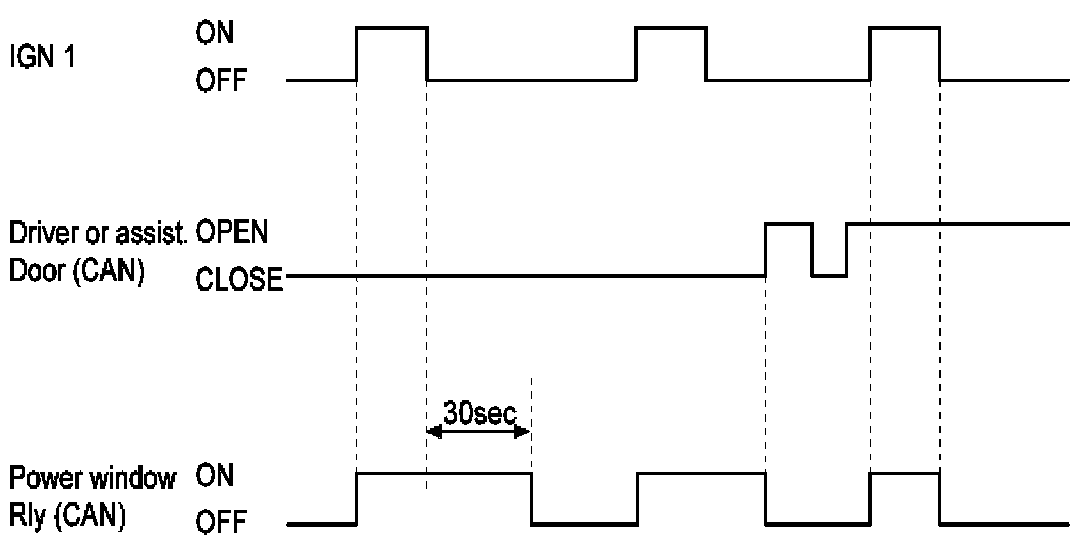 B. When IGN1 switch is turned off, the power window relay CAN signal remains on for 30 sec and then is turned OFF.
