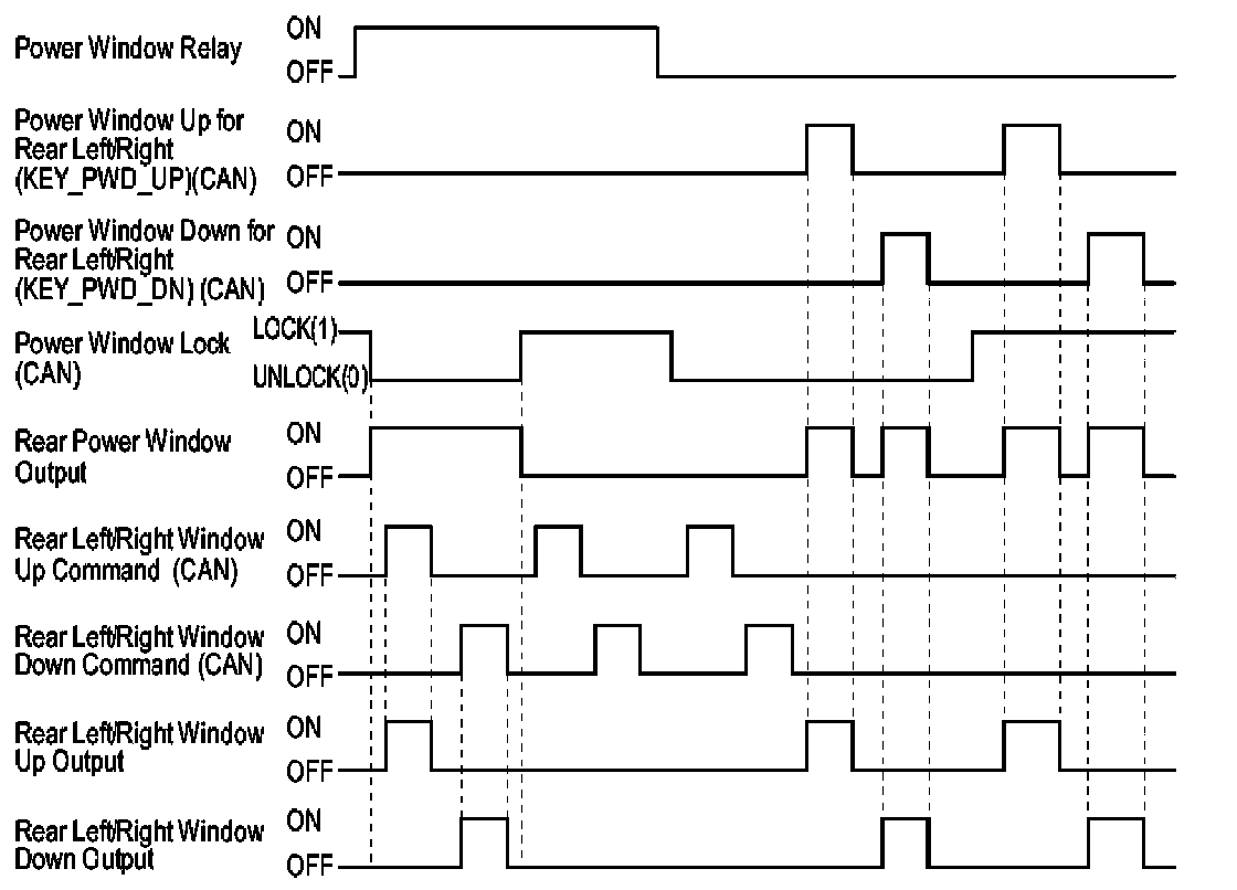 B. Operation OFF condition Power window relay OFF or Power window LOCK CAN signal LOCK and rear power window UP/DOWN CAN signal OFF.