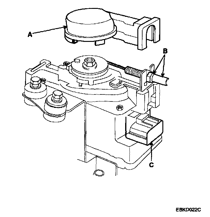 1. Loosen the locknuts (A) and disconnect the actuator cable (B) from the throttle linkage (C).