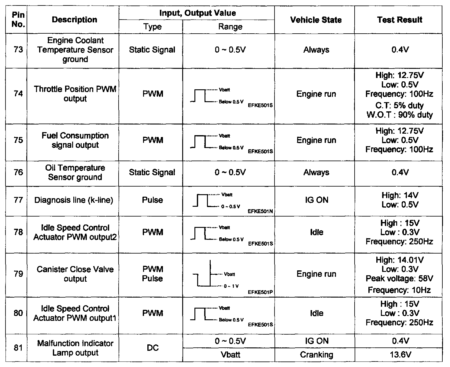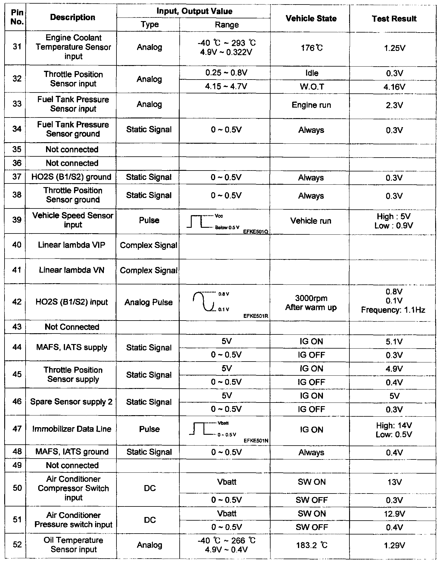 Pinout Values and Diagnostic Parameters