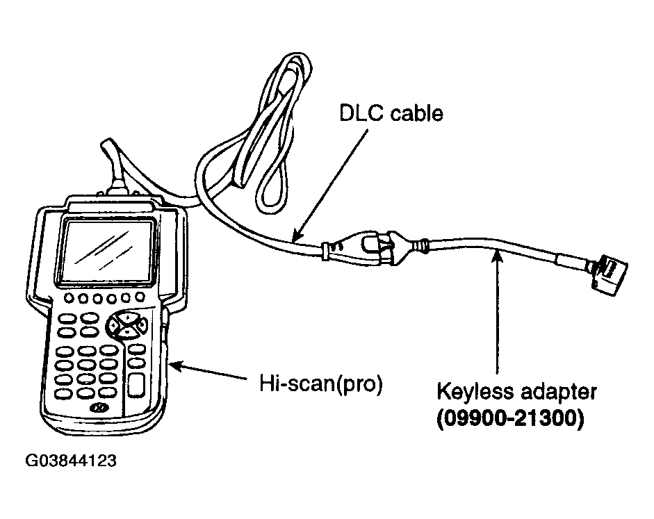 - To program the transmitter code, first connect keyless adapter (09900-21300) to DLC(Data Link Connector) cable of hi-scan as shown in Fig 1.