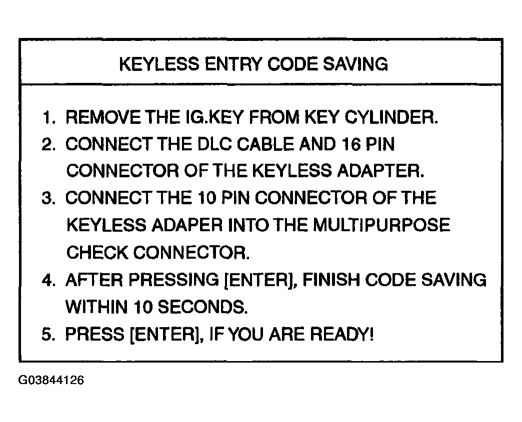 - After removing the ignition key from key cylinder, push "ENTER" key to proceed to the next mode for code saving.