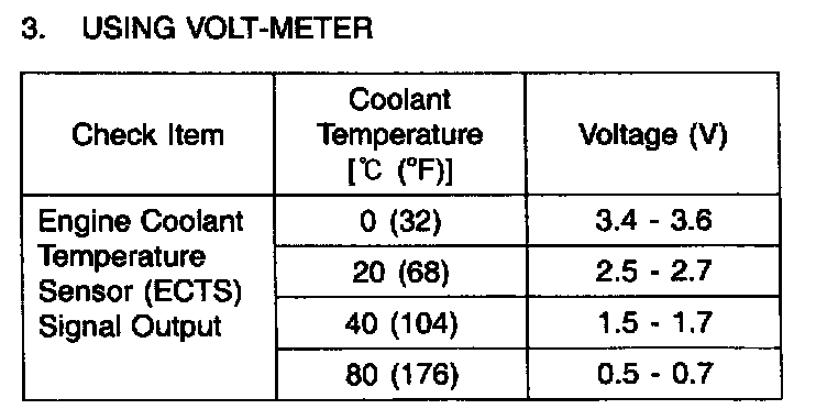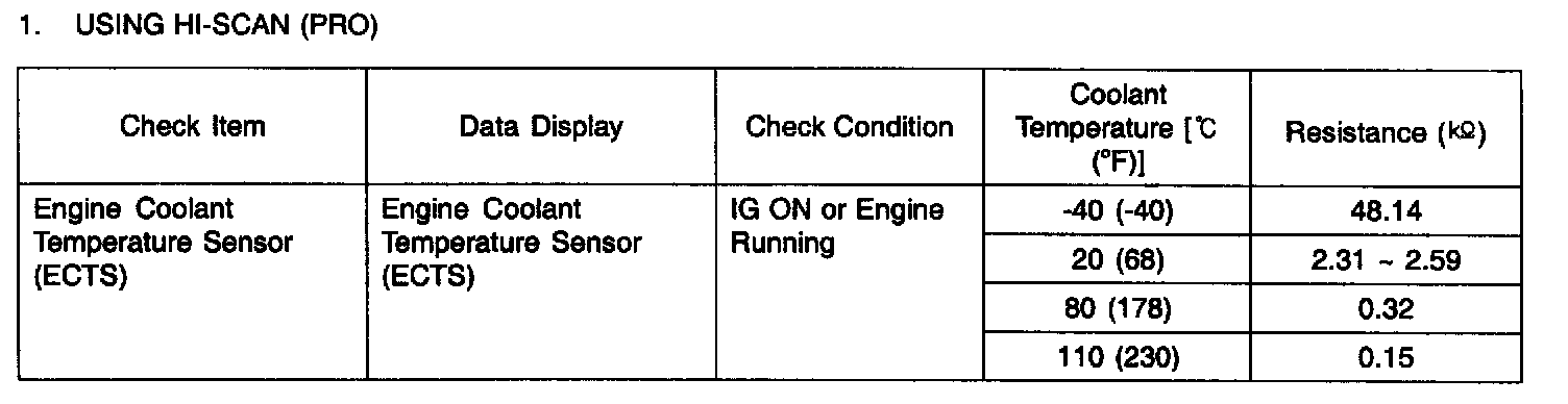ENGINE COOLANT TEMPERATURE SENSOR (WTS)Engine Coolant Temperature Sensor (ECTS) installed in the engine coolant passage of the cylinder head detects the engine coolant temperature and emits signals to the ECM. This part employs a thermistor which is sensitive to change in temperature. The electric resistance of the thermistor decreases in response to a temperature rise (NTC). The ECM determines engine coolant temperature by the sensor output voltage and provides optimum fuel enrichment when the engine is cold.