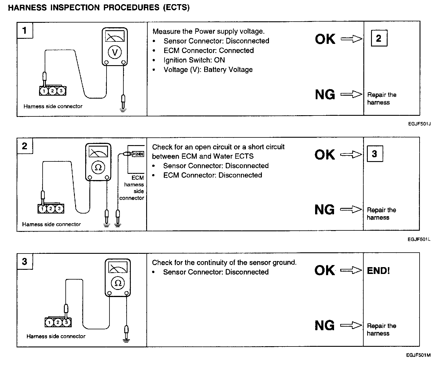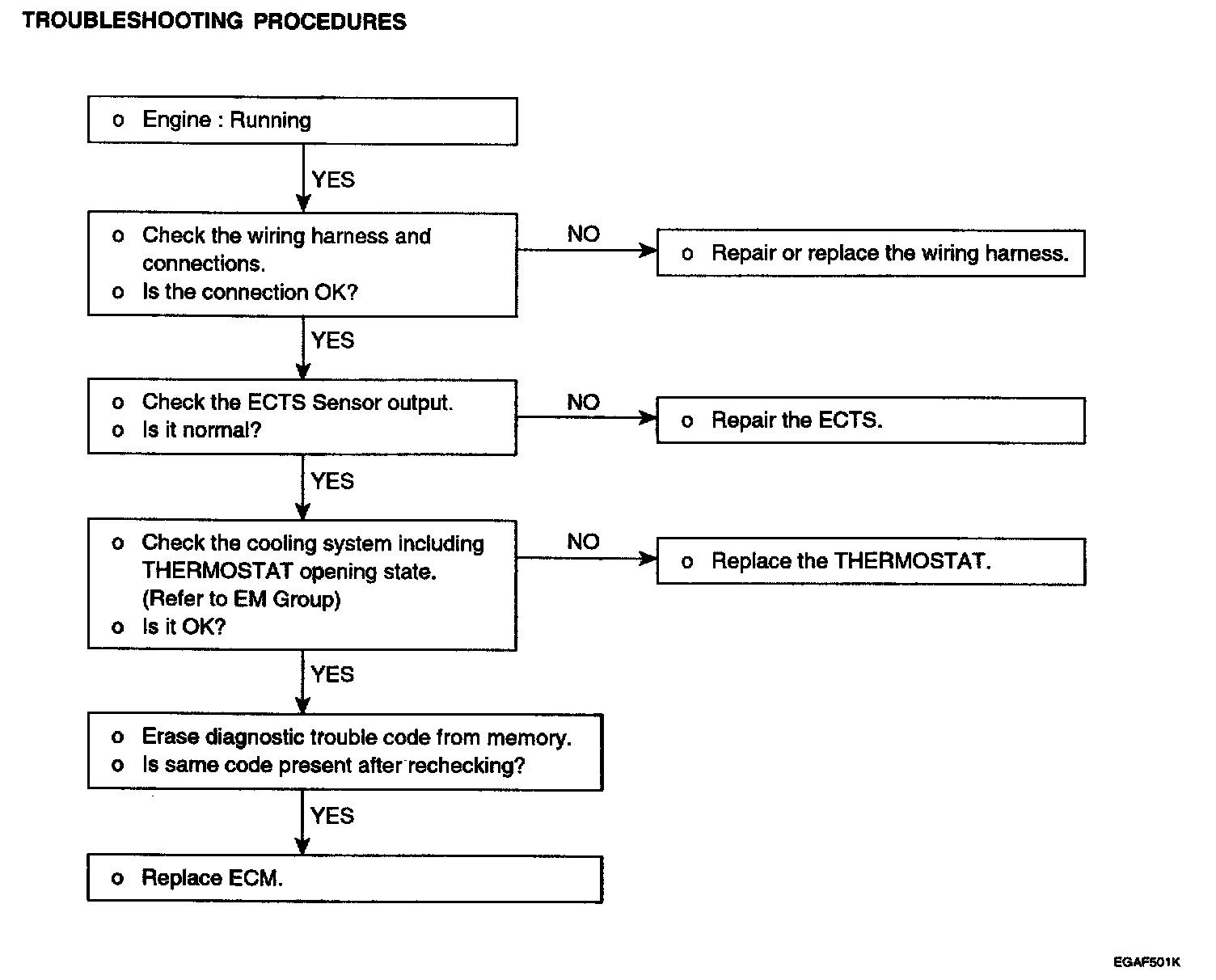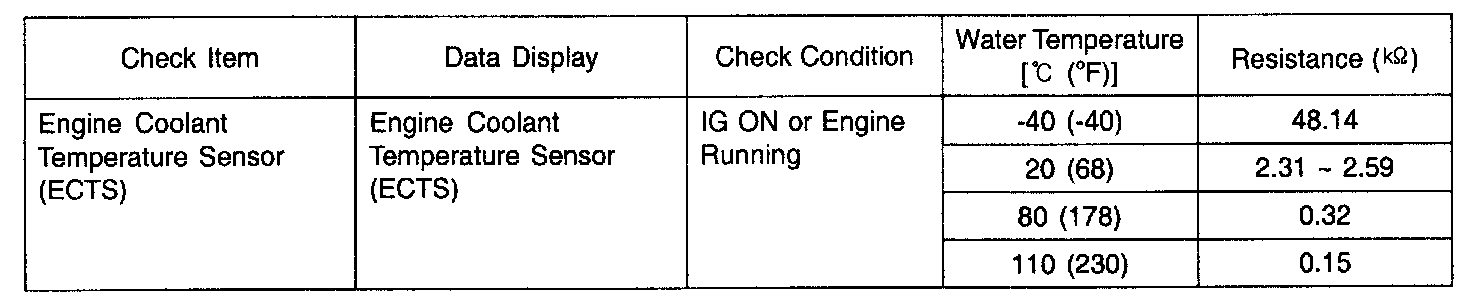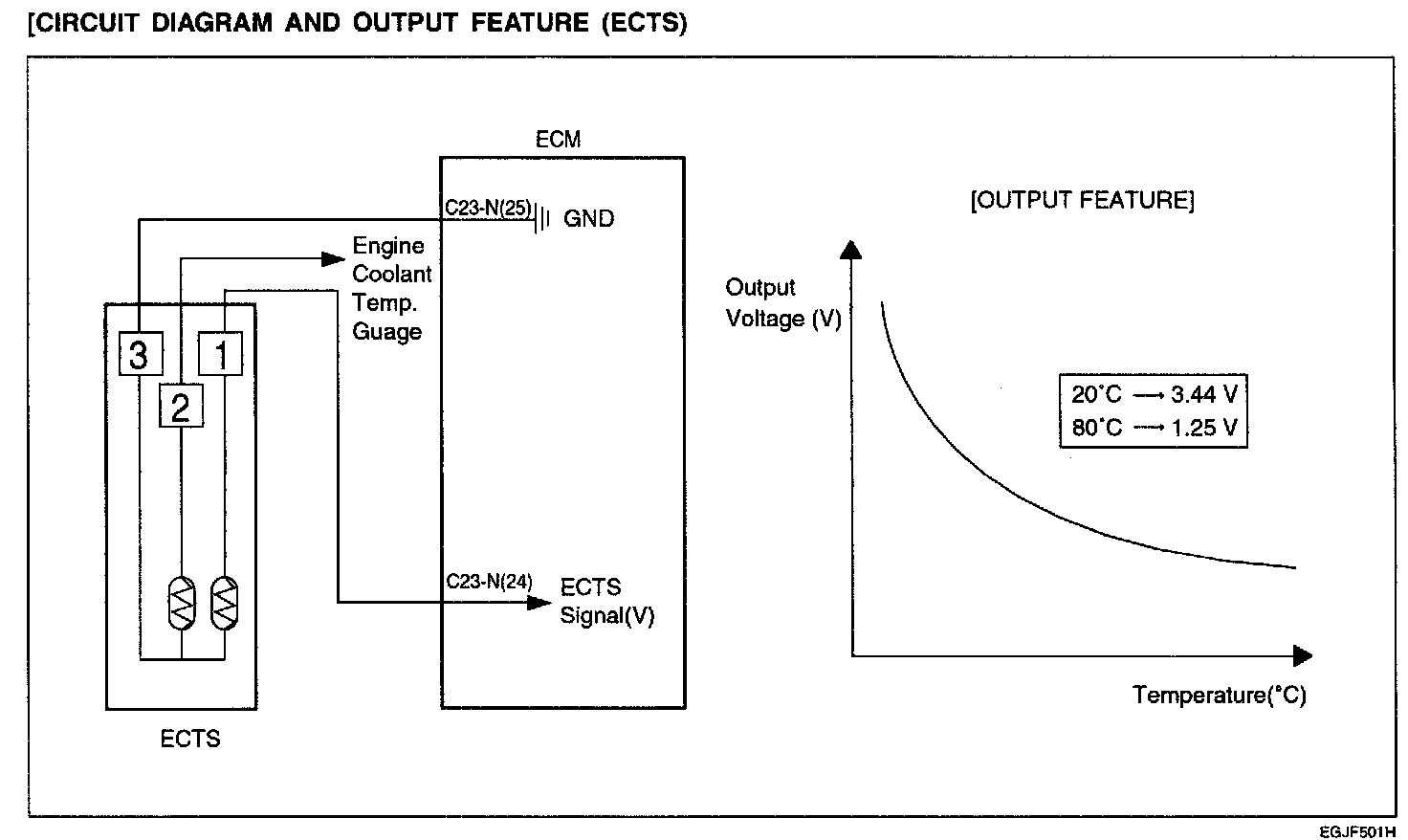 Engine Coolant Temperature Sensor (ECTS) installed in the engine coolant passage of the cylinder head detects the engine coolant temperature and emits signals to the ECM. This part employs a thermistor which is sensitive to changes in temperature. The electric resistance of the thermistor decreases in response to a temperature rise (NTC) The ECM determines engine coolant temperature by the sensor output voltage and provides optimum fuel enrichment when the engine is cold.