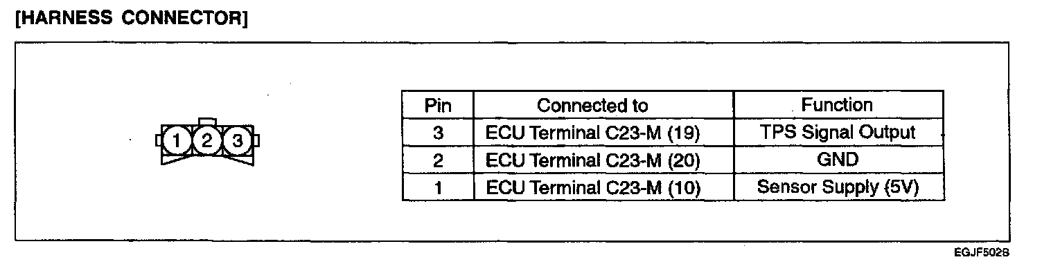 The TPS is a variable resistor type that rotates with the throttle body throttle shaft to sense the throttle valve angle. As the throttle shaft rotates, the output voltage of the TPS changes. The ECM detects the throttle valve opening based on voltage change.