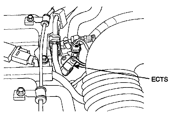 The engine coolant temperature sensor (ECTS) is located in the engine coolant passage of the cylinder head for detecting the engine coolant temperature. The ECTS uses a thermistor whose resistance changes with the temperature variation. The electrical resistance of the ECTS decreases as the temperature increases, and increases as the temperature decreases. When the resistance value of the thermistor in the ECTS changes according to the engine coolant temperature, the output voltage also changes. During cold engine operation the ECM increases the fuel injection duration and controls the ignition timing using the information of engine coolant temperature to avoid engine stalling and improve driveability.