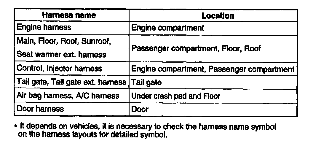 NOTE: Connectors which connect each wiring harness are represented by the symbols as in below diagram.