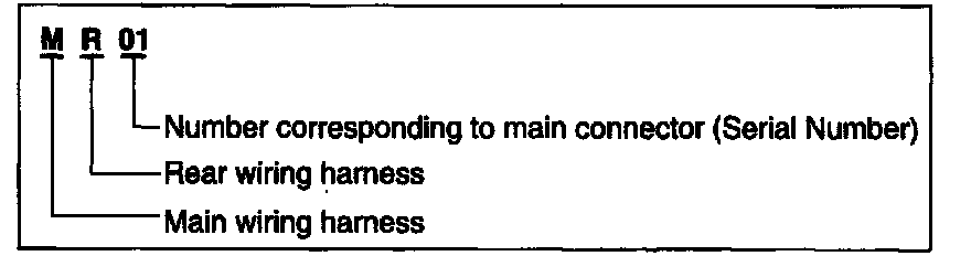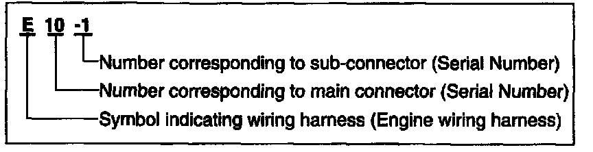 A connector identification symbol consists of a wiring harness location classification symbol corresponding to a wiring harness location and number corresponding to the connector.