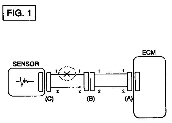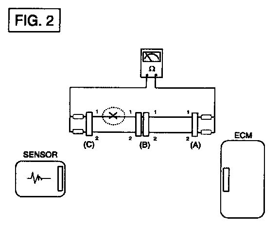 In [FIG.2.] the measured resistance of line 1 and 2 is higher than 1 MOhm and below 1 Ohm respectively. Specifically the open circuit is line 1 (Line 2 is normal). To find exact break point, check sub line of line 1 as described in next step.