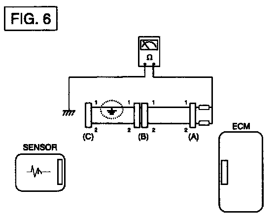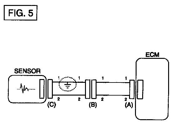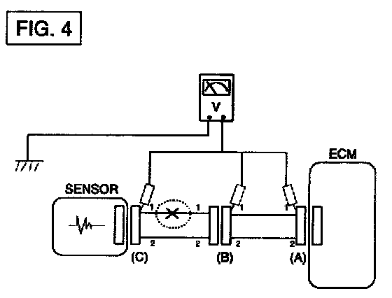 a. With each connector still connected, measure the voltage between the chassis ground and terminal 1 of each connectors (A), (B) and (C) as shown in [FIG. 4].