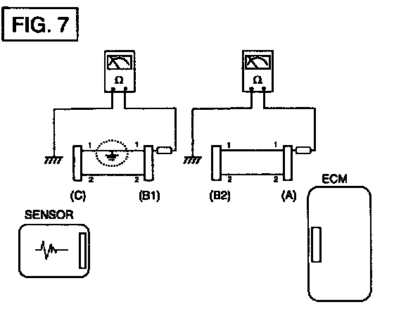 b. Disconnect connector (B), and measure the resistance between connector (A) and chassis ground, and between (B1) and chassis ground as shown in [FIG. 7].