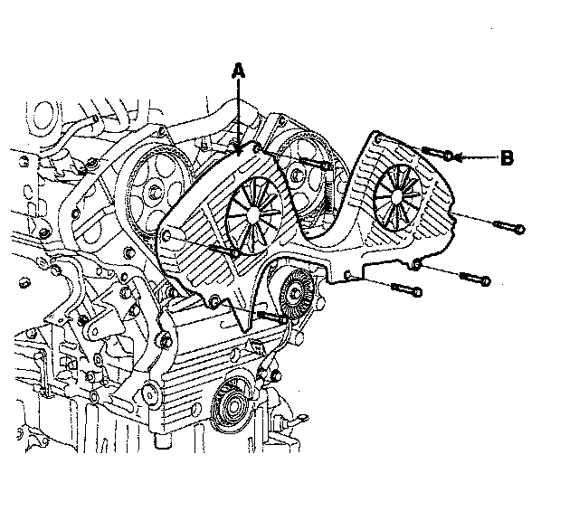 Install the timing belt upper cover (A) with 7 bolts (B).