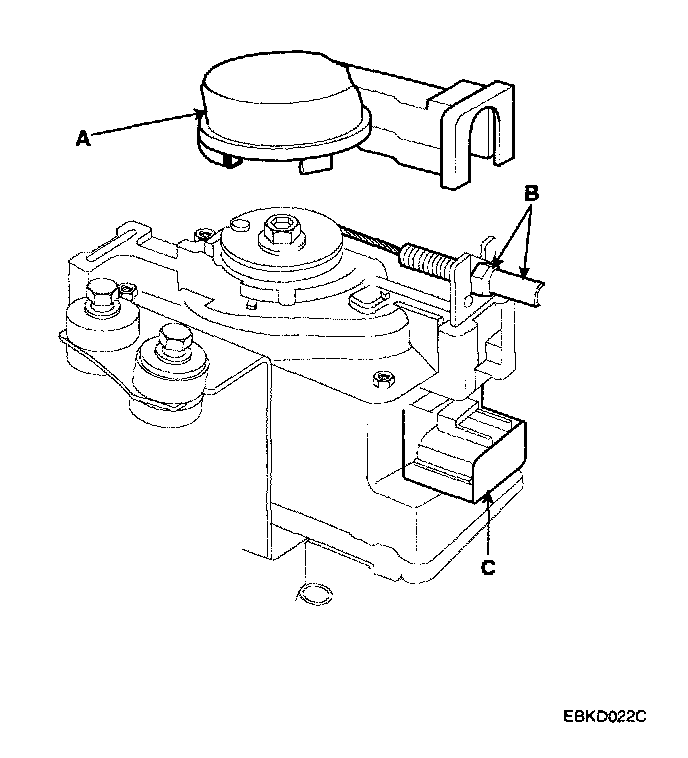1. Loosen the locknuts(A) and disconnect the actuator cable (B) from the throttle linkage(C).