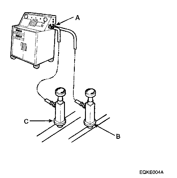 1. Connect a R-134a refrigerant recover/recy-cling/charging station (A) to the high-pressure service port (B) and the low-pressure service port (C), as shown, following the equipment manufacturers instructions.