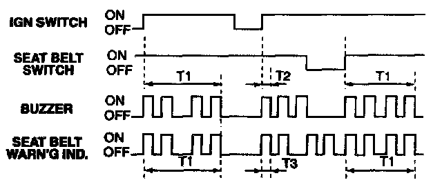 1. Since the ignition is switched ON, the seat belt warning indicator is illuminated (with period: 0.6 Seconds, duty rate: 50%) and the buzzer is sounded (with period: 0.9 seconds, duty rate: 50%) for total time 6 seconds.