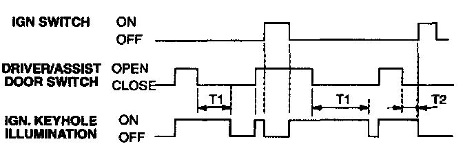 - When the driver's door key UNLOCK switch is ON during T1 after the transmitter's UNLOCK signal is detected, the 4 door UNLOCK relay is ON for T3.