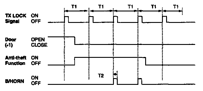 1. If "LOCK" button of the transmitter is pushed, when 4 doors are closed, the burglar alarm horn operates for 'T2', 4 sec(T1) after engaging "LOCK" button.