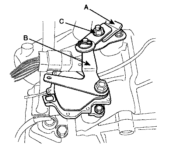 8. Adjust the adjusting nut(C) so that there is no slack in the control cable(A) and make sure that the select lever(B) operates smoothly.