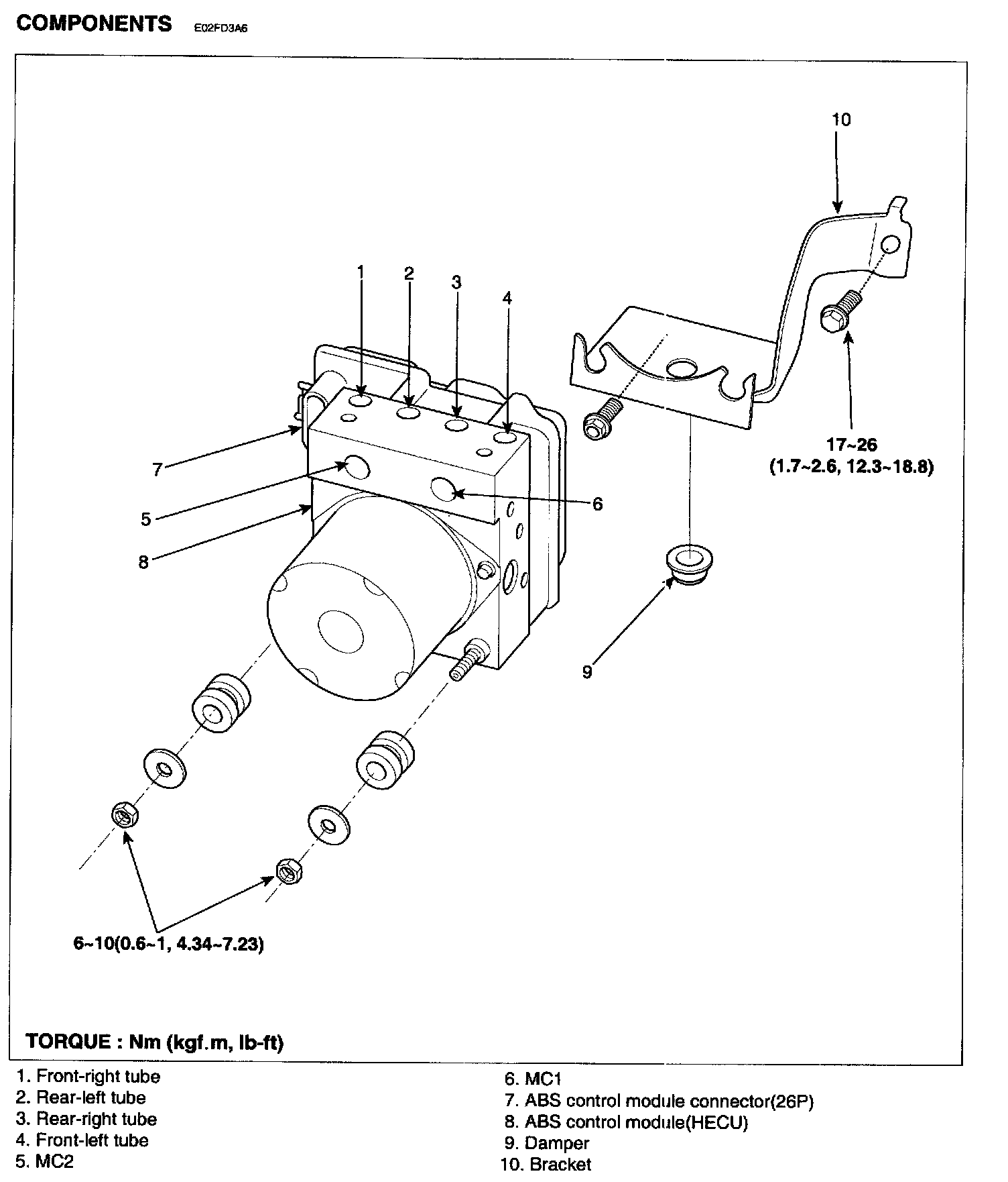 HECU bracket mounting bolt: 17-26 Nm (1.7-2.6 kgf-m, 12.3-18.8 lb-ft)