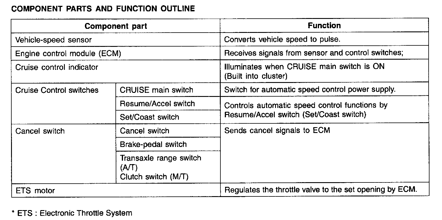 The main components of cruise control system are mode control switches, transaxle range switch, brake switch, vehicle speed sensor, ECM and ETS motor that connect throttle body.