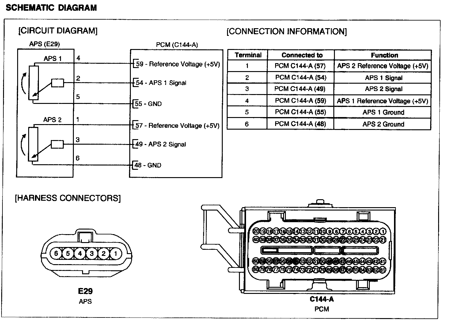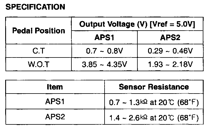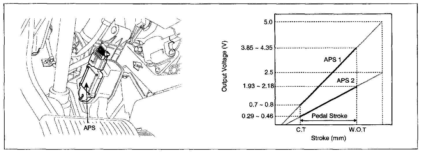 Accelerator Position Sensor (APS) is installed on the accelerator pedal module and detects the rotation angle of the accelerator pedal. The APS is one of the most important sensors in engine control system, so it consists of the two sensors which adapt individual sensor power and ground line. The second sensor monitors the first sensor and its output voltage is half of the first one. If the ratio of the sensor 1 and 2 is out of the range (approximately 1/2), the diagnostic system judges that it is abnormal.
