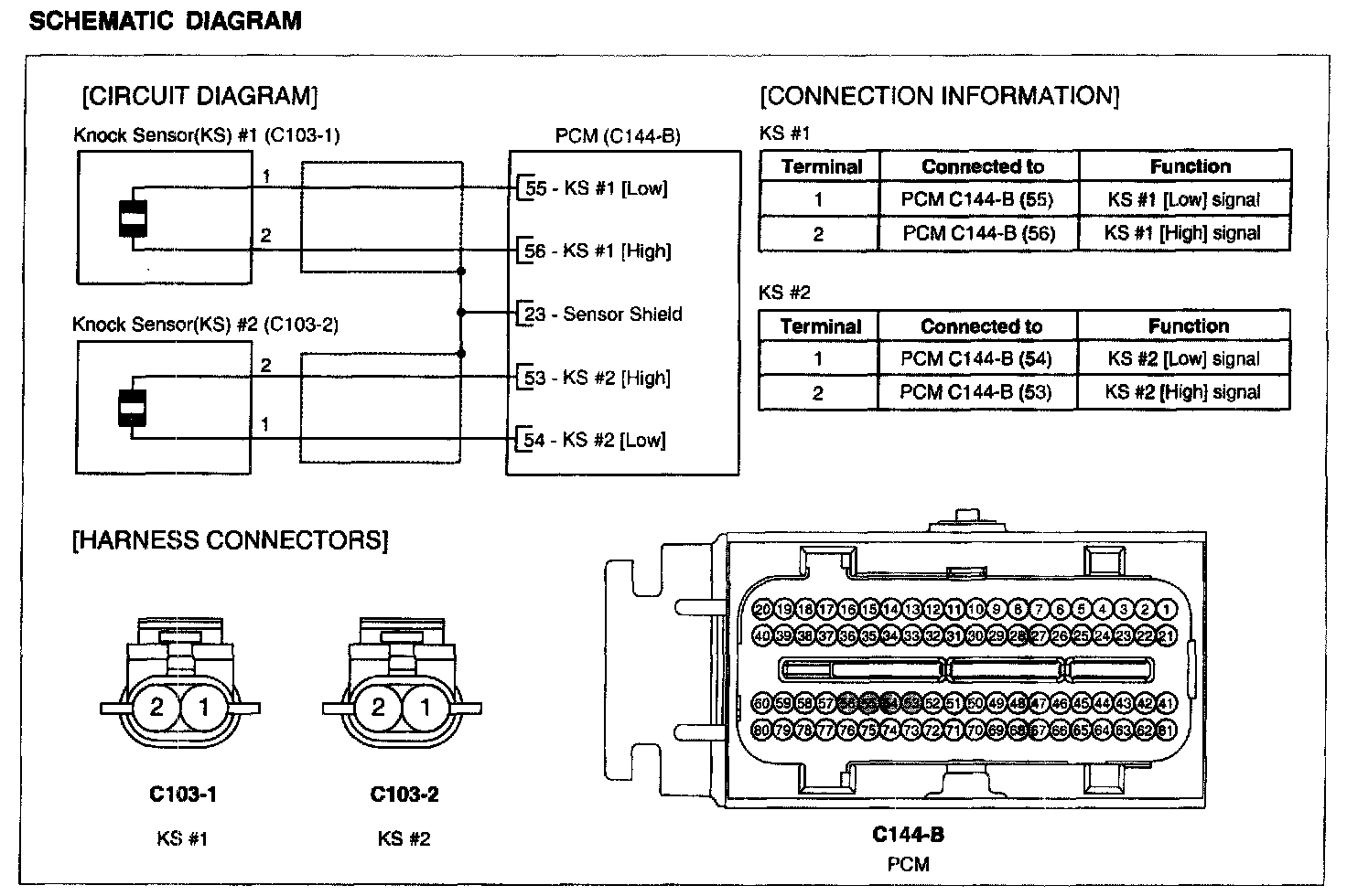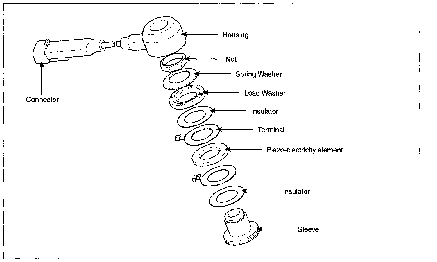 Knocking is a phenomenon characterized by undesirable vibration and noise and can cause engine damage. Knock Sensor (KS) senses engine knocking and the two sensors are installed inside the V-valley of the cylinder block. When knocking occurs, the vibration from the cylinder block is applied as pressure to the piezoelectric element. At this time, this sensor transfers the voltage signal higher than the specified value to the PCM and the PCM retards the ignition timing. If the knocking disappears after retarding the ignition timing, the PCM will advance the ignition timing. This sequential control can improve engine power, torque and fuel economy.