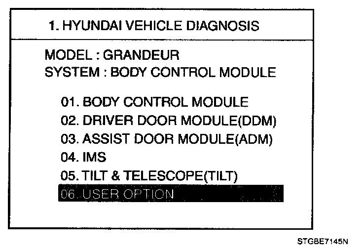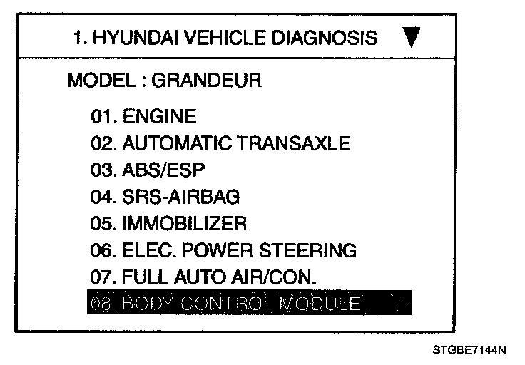 Home >> Hyundai >> 2007 >> Azera V6-3.3L >> Repair and Diagnosis >> Powertrain Management >> Computers and Control Systems >> Relays and Modules - Computers and Control Systems >> Body Control Module >> Testing and Inspection >> Scan Tool Testing and Procedures >> Trouble Diagnostics When Using Diagnosis Tool