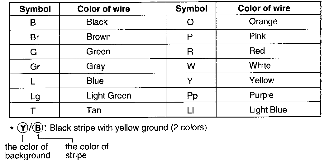 The following abbreviations are used to identify wire colors in the circuit schematics.