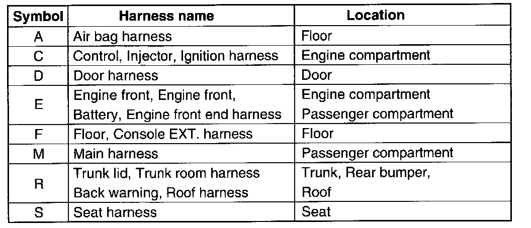 - It depends on vehicles, it is necessary to check the harness name symbol on the harness layouts for detailed symbol.