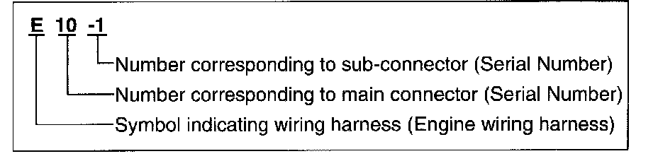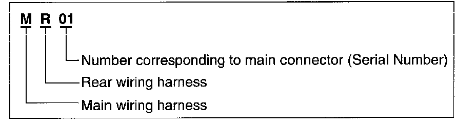 A connector identification symbol consists of a wiring harness location classification symbol corresponding to a wiring harness location and number corresponding to the connector.