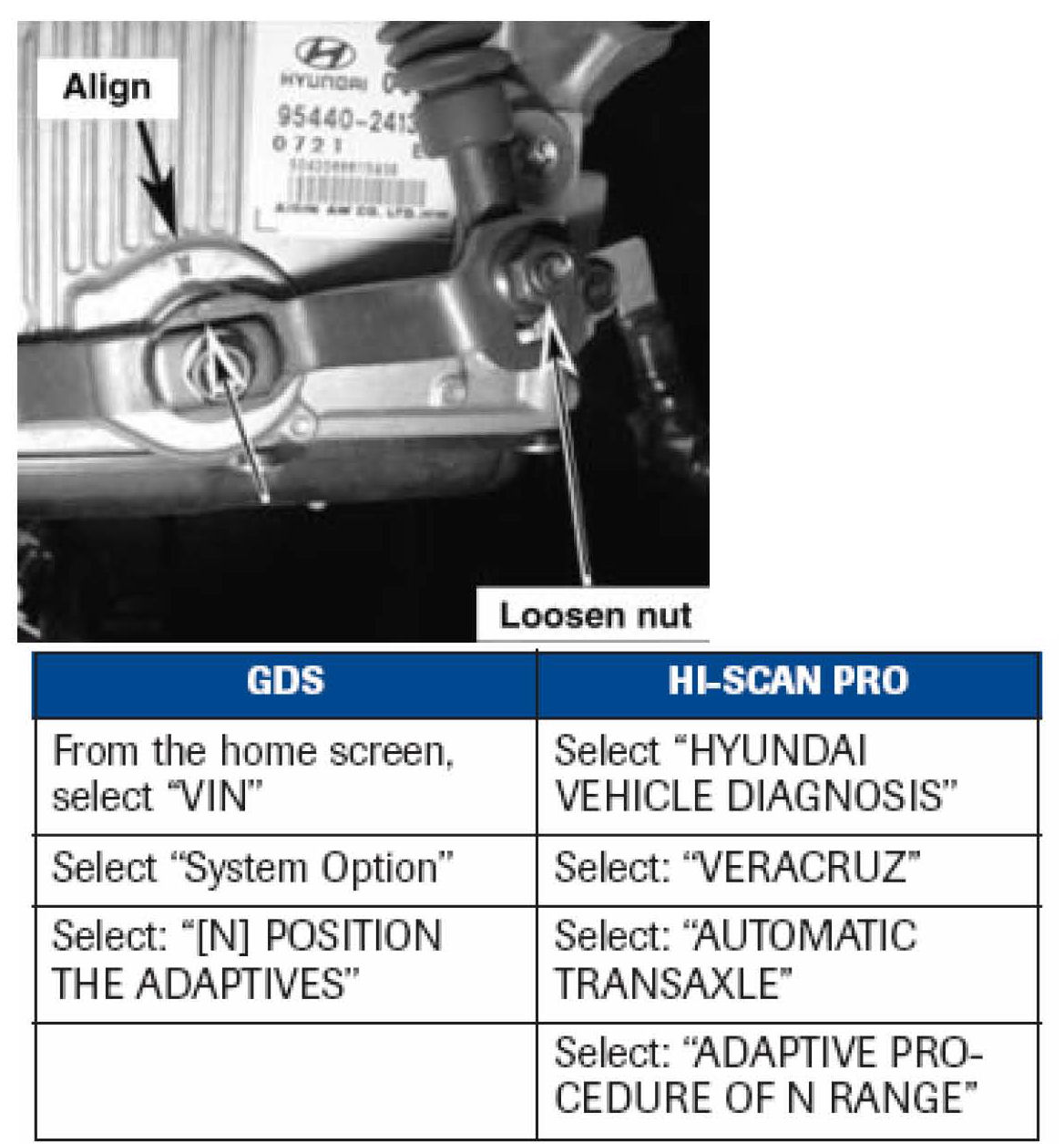 If the transaxle or transaxle control unit is replaced, the TCU adaptive learning values must be reset (erased) and the range switch neutral position must be relearned using either the GDS or Hi-Scan Pro. If the following procedures are not completed, the following conditions may occur: