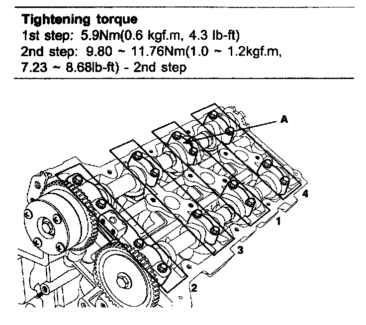 CVVT & exhaust cam sprocket bolt 64.68-76.44 Nm (6.6-7.8 kgf-m, 47.74-56.42 ft. lbs.)