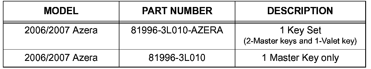 Azera immobilizer key blanks can be ordered either in singles (i.e. 1- master) or complete key sets (i.e. 2-master keys and 1-sub or valet key). However, HMA Parts Distribution Centers will only pre-cut complete key sets upon request. They will NOT cut single master keys.