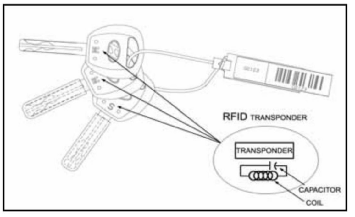 The immobilizer system is an electronic anti-theft device that prevents the vehicle from being started unless a specific pre-programmed key is used (up to 4 programmed keys per vehicle). Each of these keys contain a low-power RFID transponder in the head that holds an encrypted code. When the vehicle's ignition switch is turned to the "ON" position, the coil antenna in the ignition switch must receive the correct signal from the transponder in the key or the engine will not start (crank-no start). This system prevents theft where the ignition switch is hot-wired or even where a copy of the vehicle key has been obtained (without first programming the key with the vehicle's specific code).