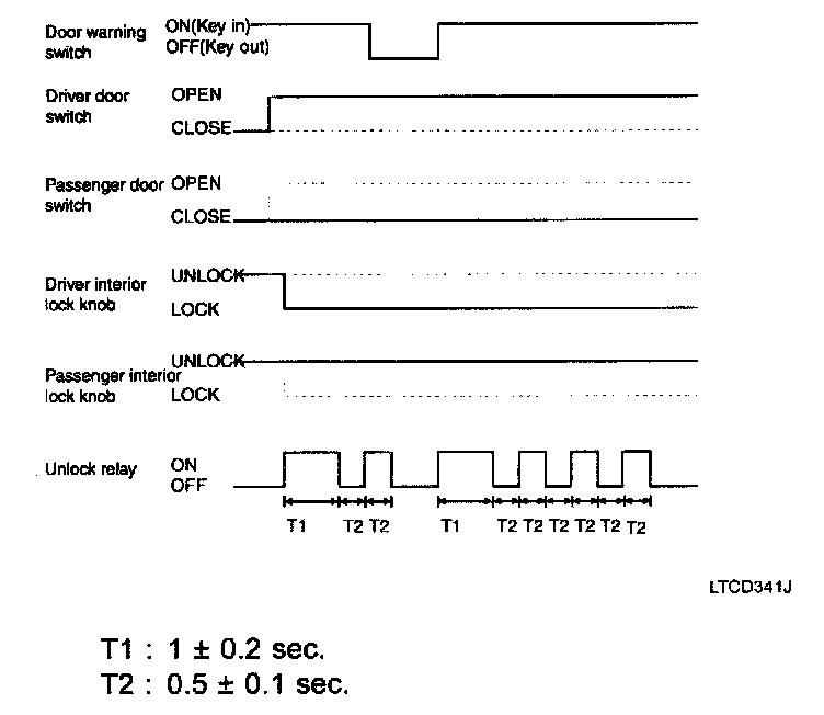 1. If the door switch of driver side or passenger side is locked when door warning switch is turned on and (CAN communication reception), driver side or passenger side door is open, it executes unlock output for 1 second. If the passenger side door remains locked even after the unlock output, it repeats on and off 3 times with the time interval of 0.5 seconds.