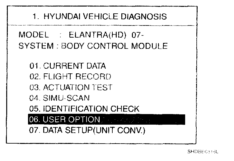 Home >> Hyundai >> 2007 >> Elantra L4-2.0L >> Repair and Diagnosis >> Powertrain Management >> Computers and Control Systems >> Body Control Module >> Testing and Inspection >> Scan Tool Testing and Procedures >> User Option Mode