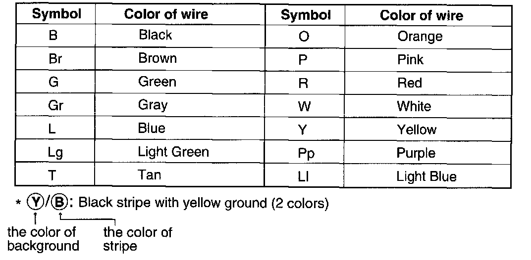 The following abbreviations are used to identity wire colors in the circuit schematics.
