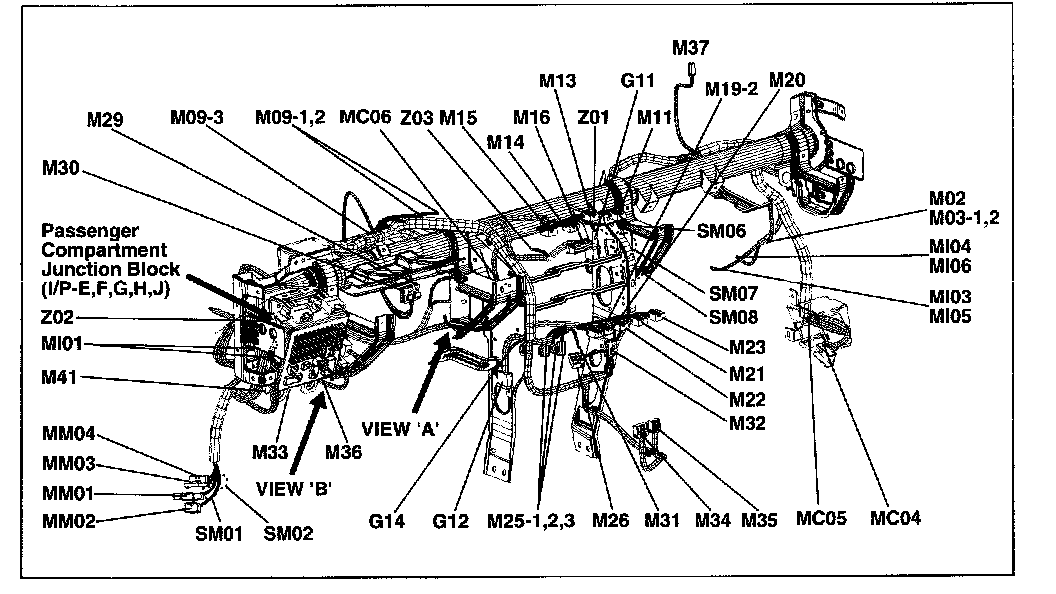 A junction block identification symbol consists of a wiring harness location classification symbol corresponding to a wiring harness location and number corresponding to the connector in the junction block.